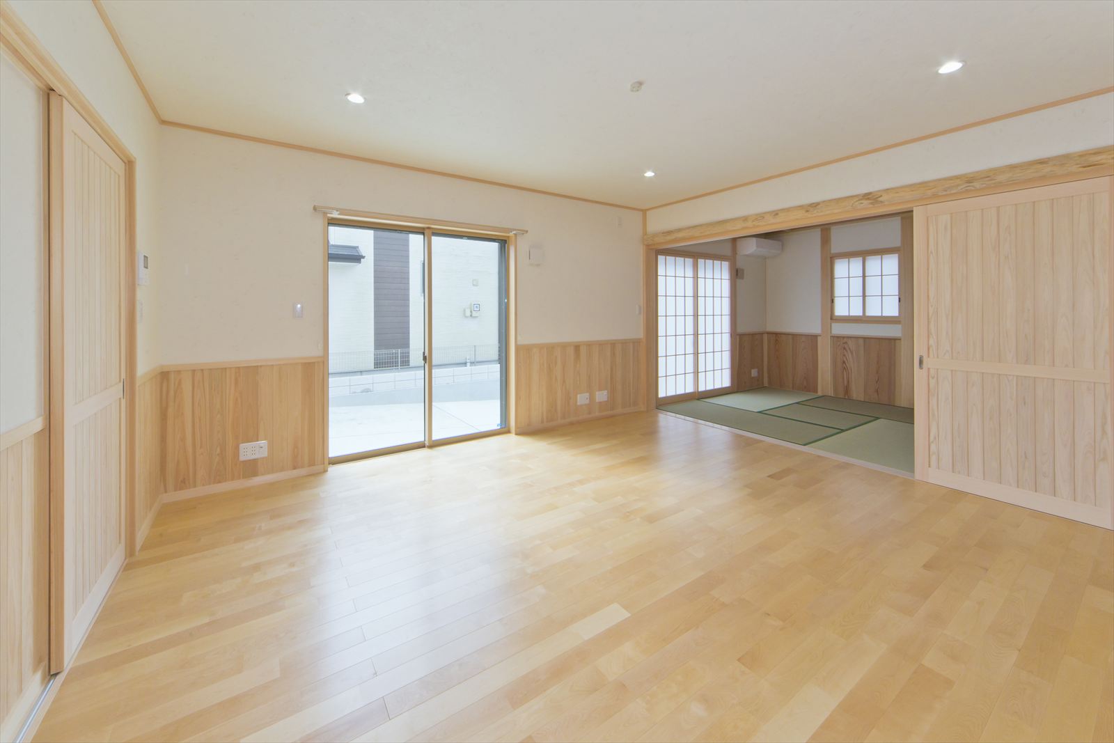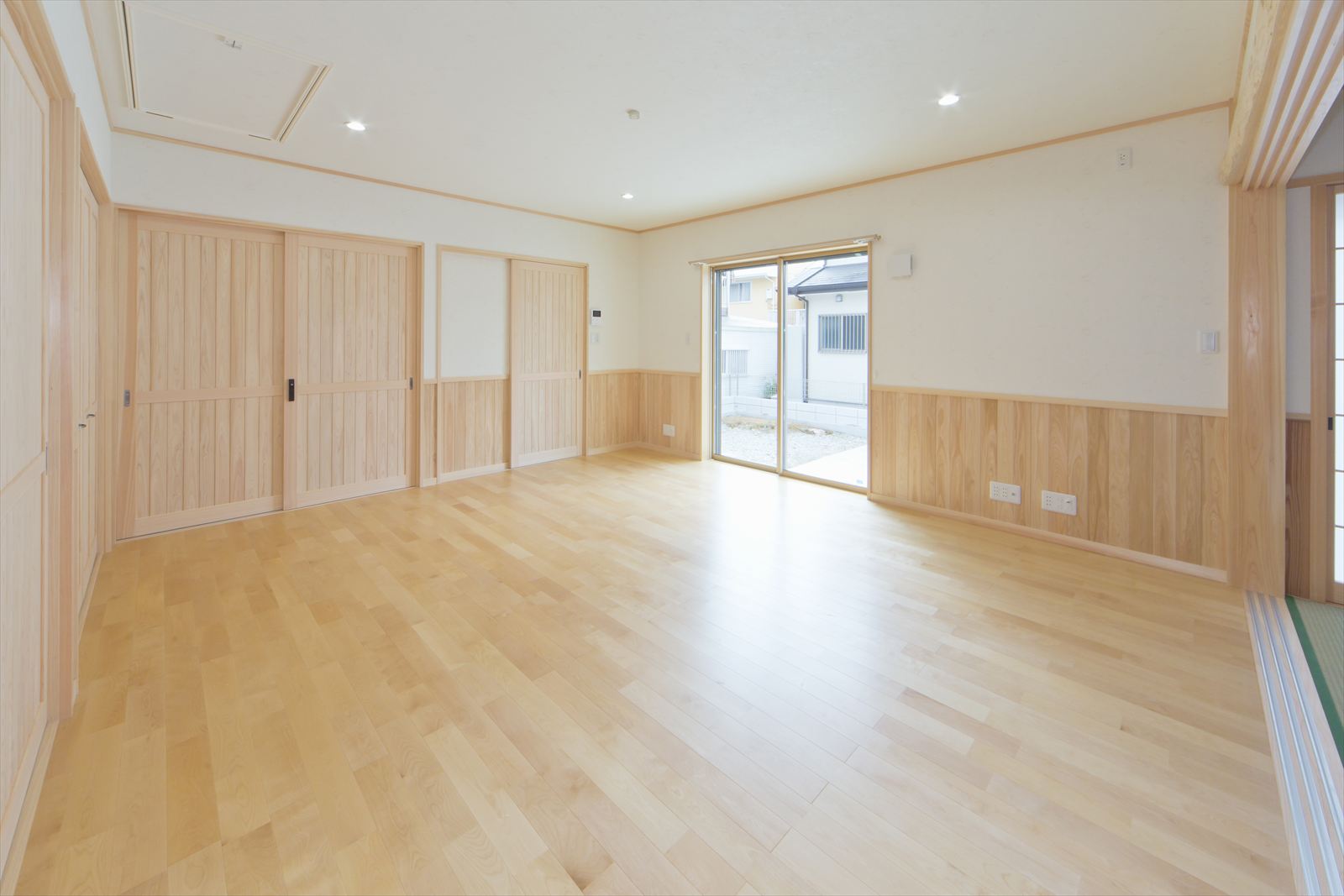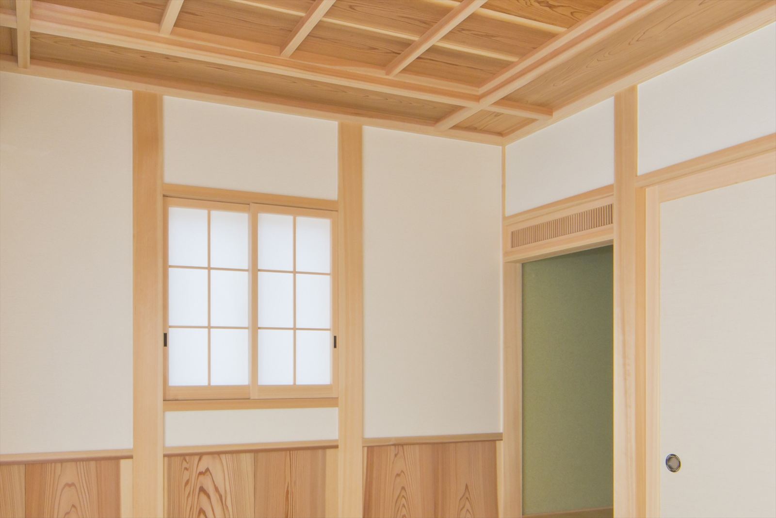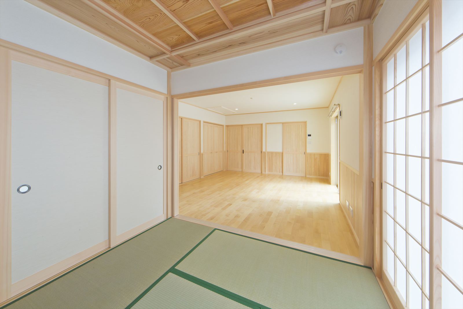 玄関までのアプローチは、将来の事を考えて階段とスロープを備えた平屋の住宅。リビングを中心に和室・プライベートルーム・収納が配置され無駄のないコンパクトなご自宅が完成いたしました。いたるところに桧や杉を使用しており、その中でも玄関の扉を開けて最初に目に入るのが、職人さん手作りの下駄箱。厚みのある杉板の天板は、年月を重ねるほど深みを増していくことでしょう。