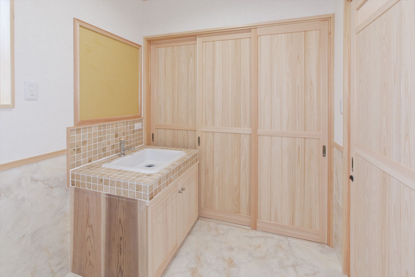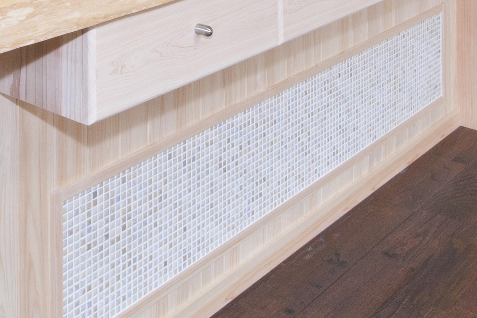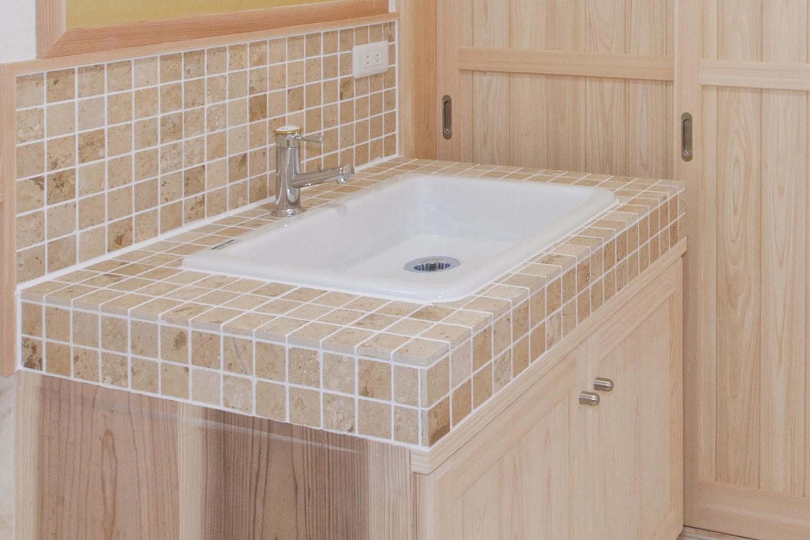 ・モザイクタイルをあしらったキッチンカウンターと洗面化粧台