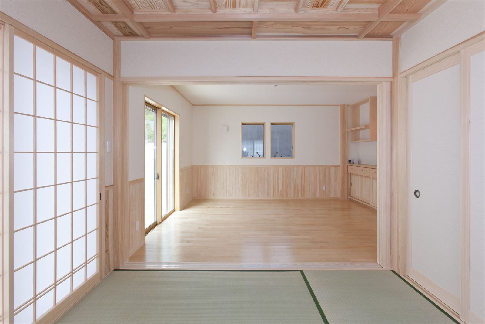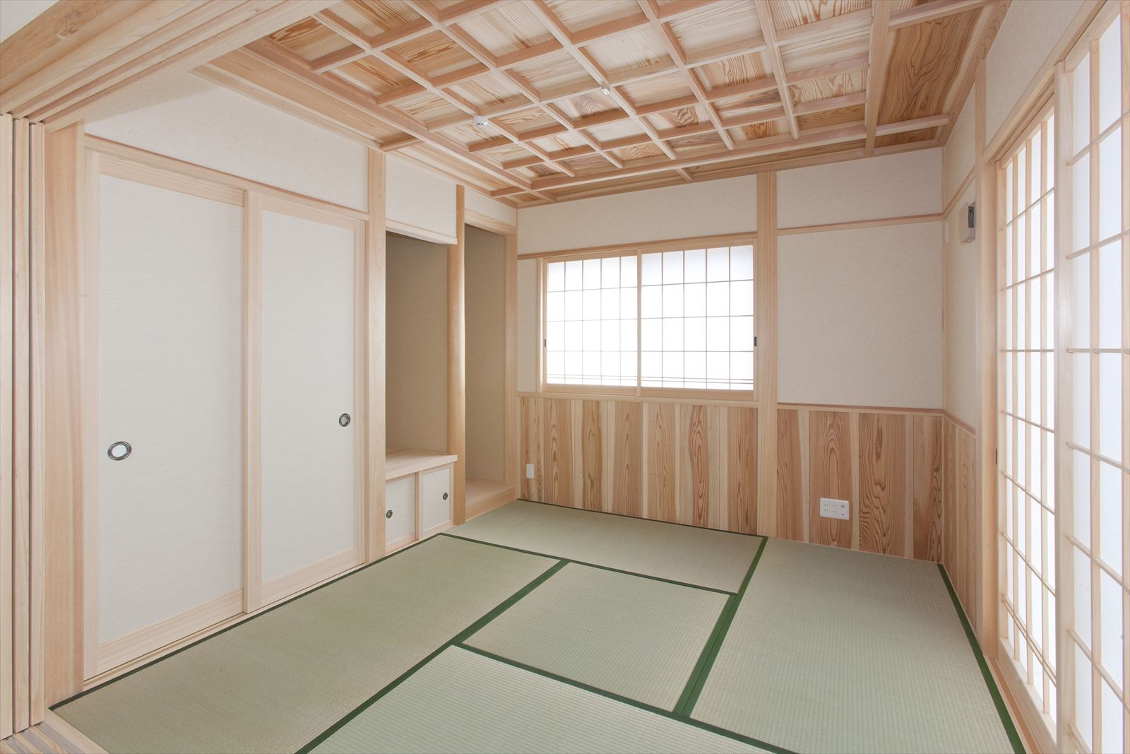 ・和室は、杉板の格子天井と腰壁