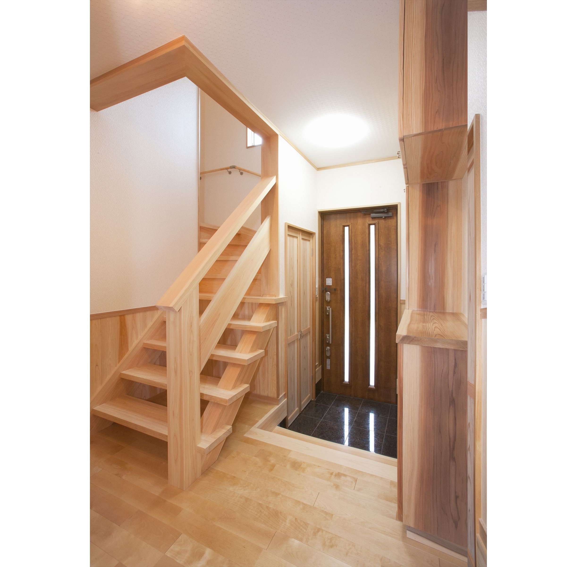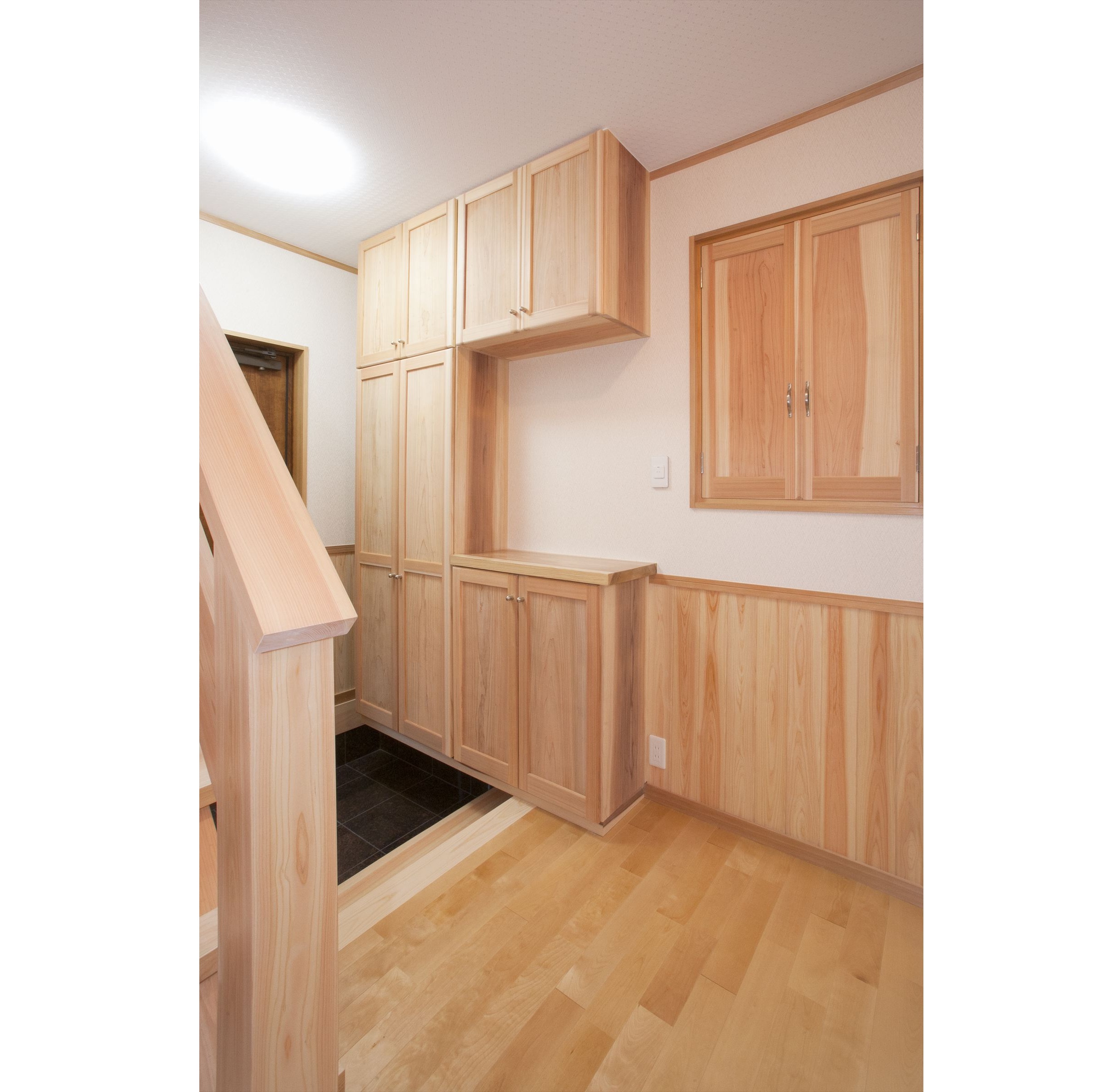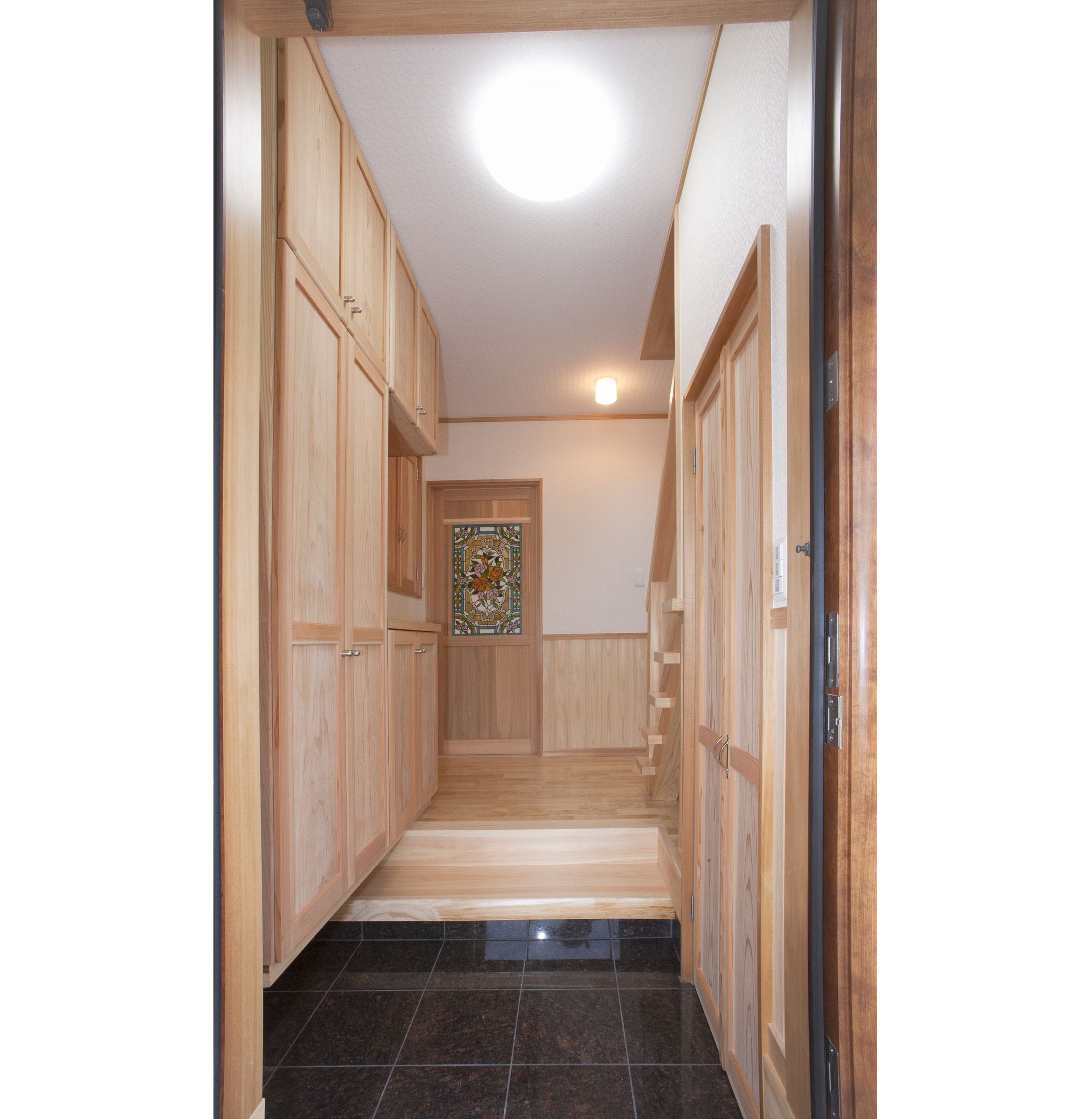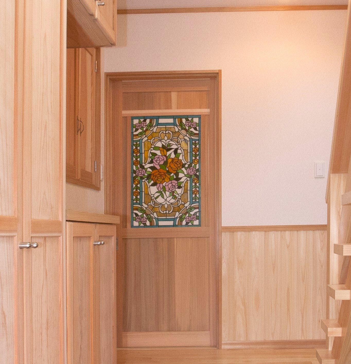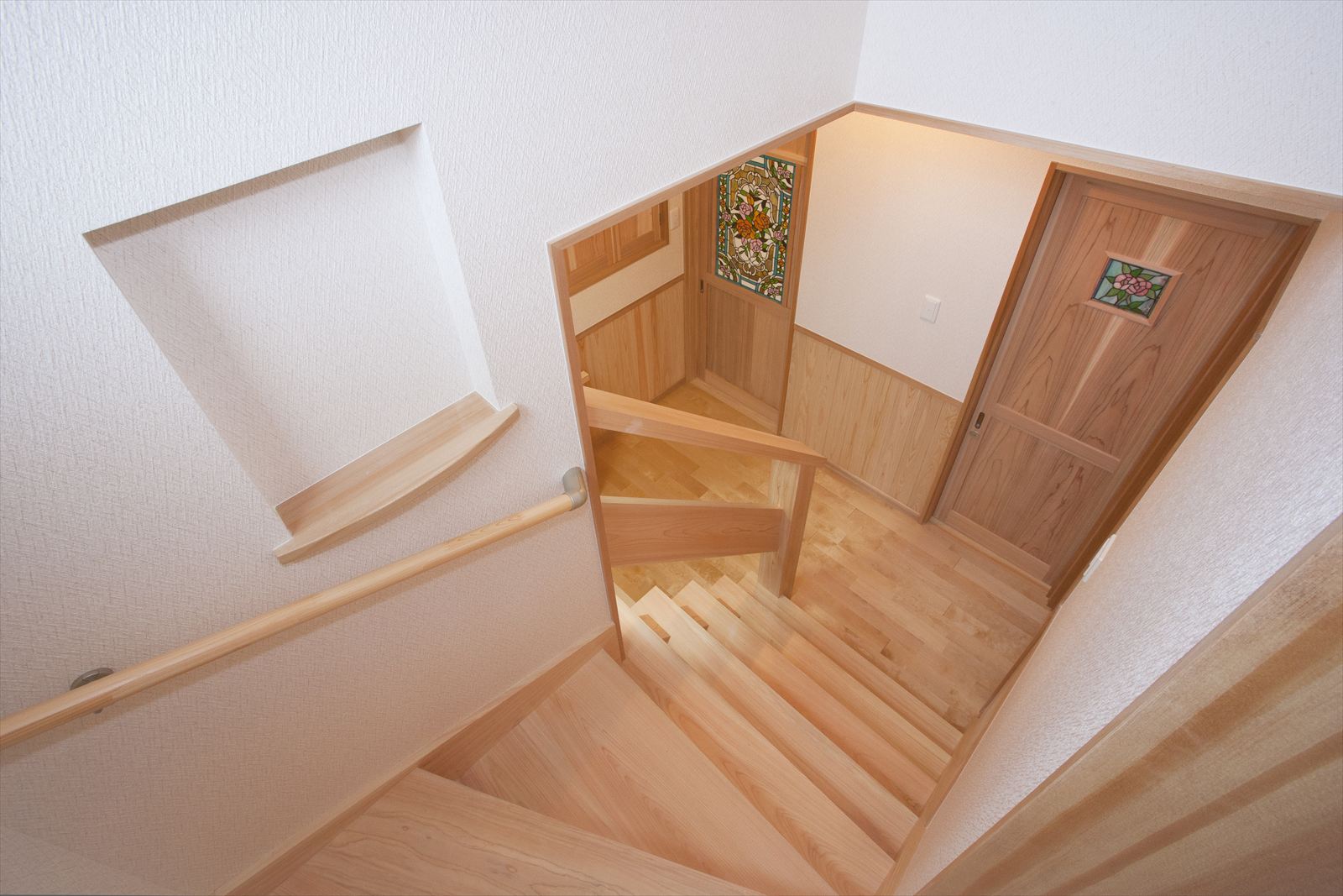 ・玄関ポーチは色の御影石 ・手作りの下駄箱 ・手作り建具にはステンドグラスを ・キッチンの手元に便利なニッチ ・階段の壁にお洒落なニッチ ・洗面脱衣室やトイレの壁に桧