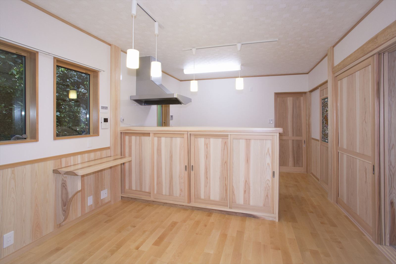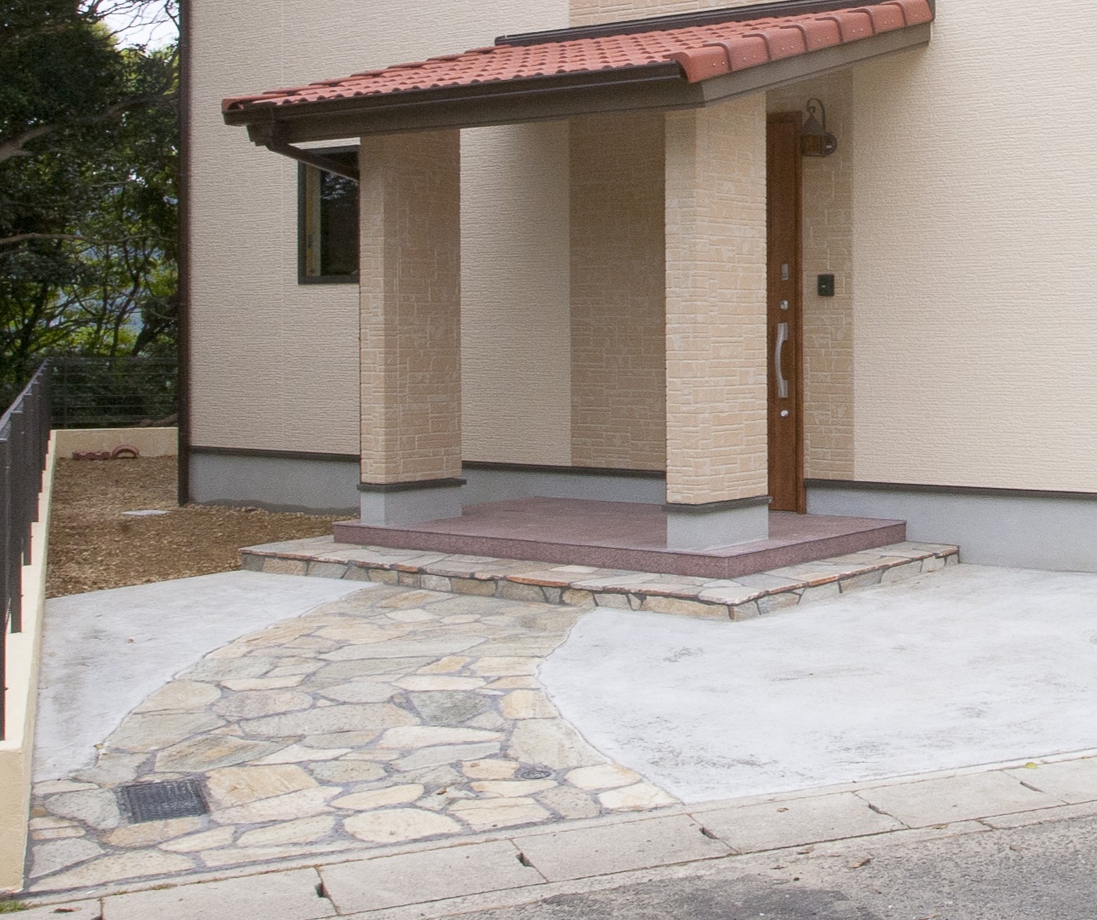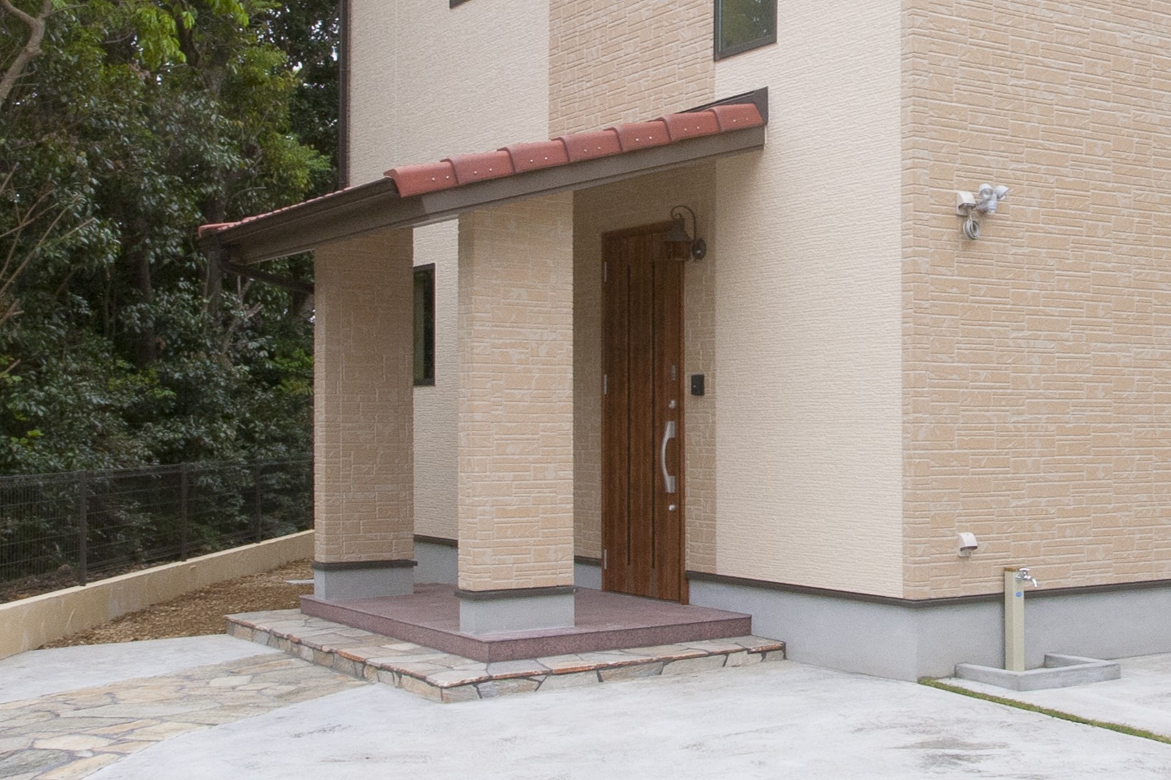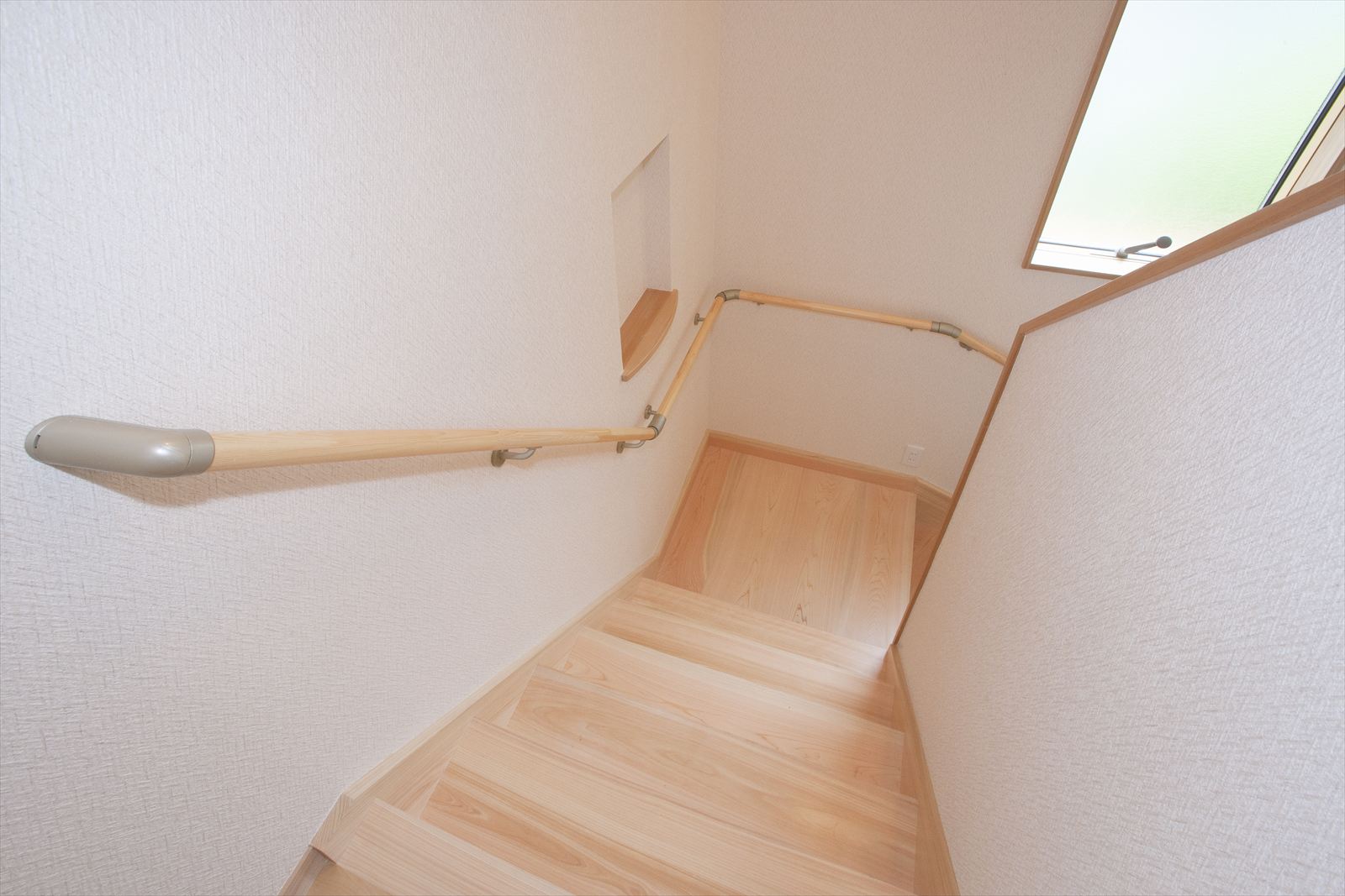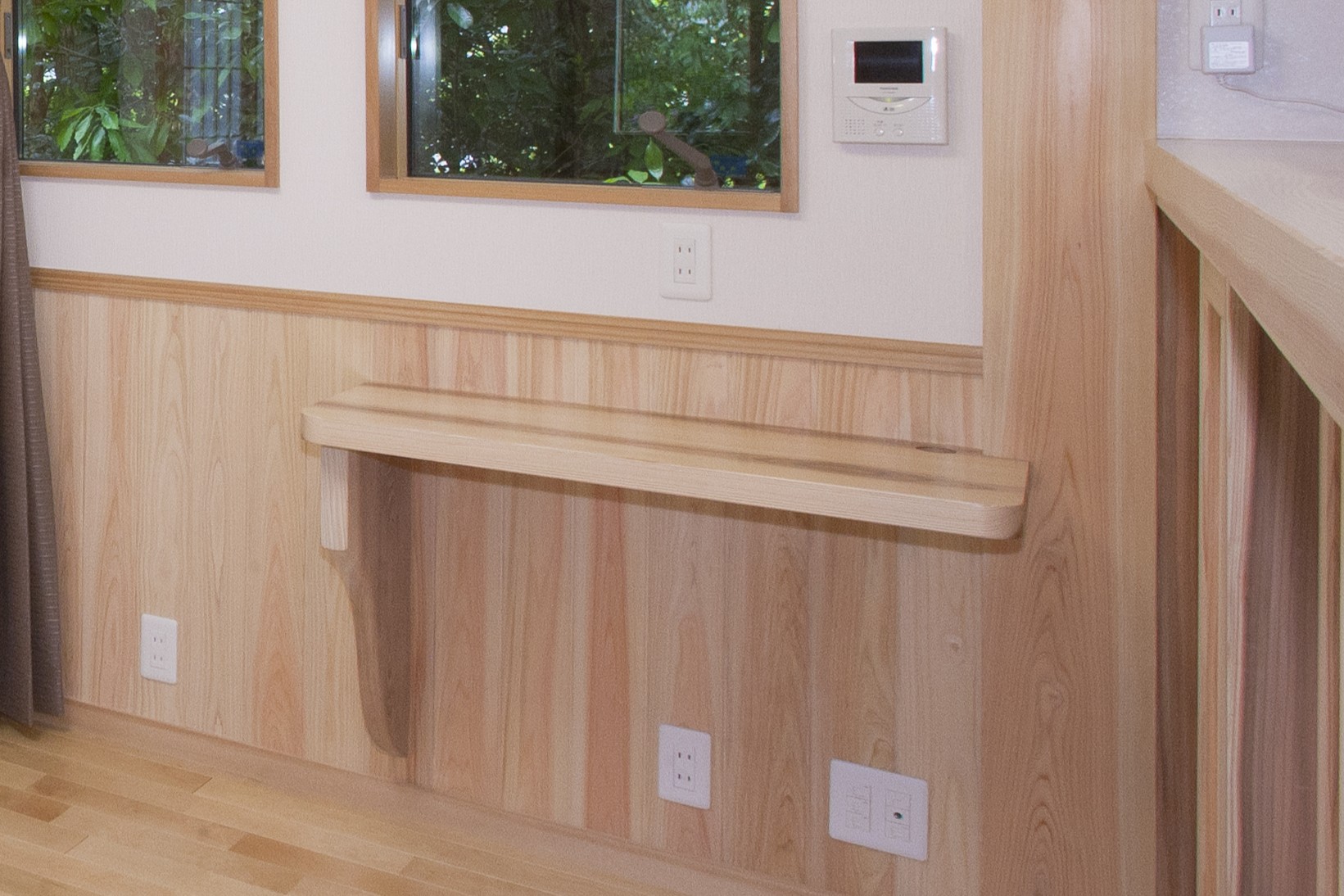 ・玄関ポーチは色の御影石 ・手作りの下駄箱 ・手作り建具にはステンドグラスを ・キッチンの手元に便利なニッチ ・階段の壁にお洒落なニッチ ・洗面脱衣室やトイレの壁に桧