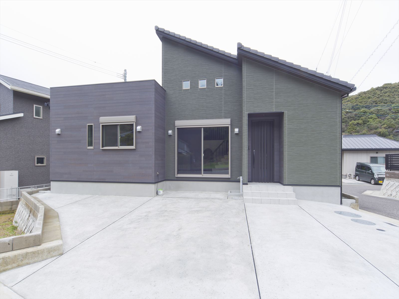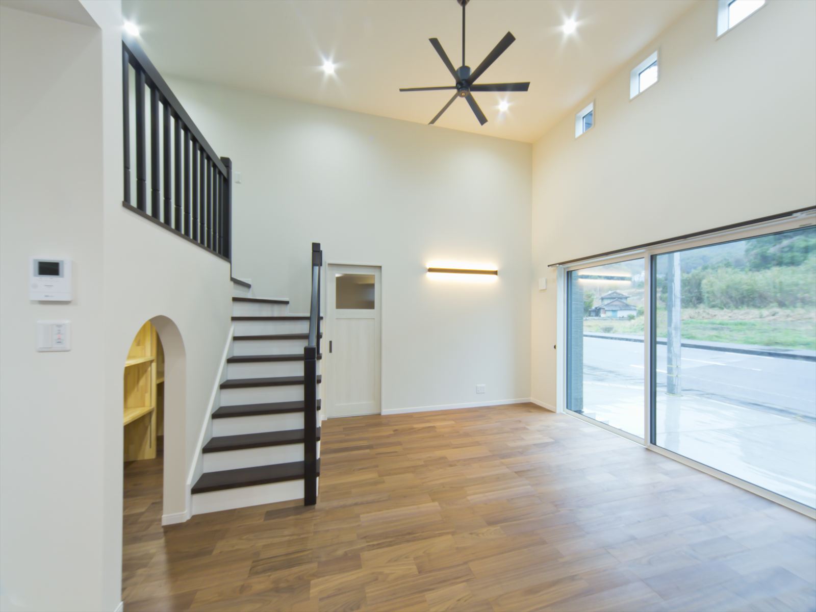 高い天井のFIX窓から明かりが差し込む吹き抜けのリビングでは、ブラックの階段手摺が印象的な、スキップフロアが目を引きます。スキップフロアの上階は、多目的スペースとして利用でき、その下階は、スタディーコーナーとして活用できるように広いカウンターと収納棚も完備されています。また、キッチンにパントリー、玄関にはシューズクロークなど、各所に収納への工夫も見逃せません。