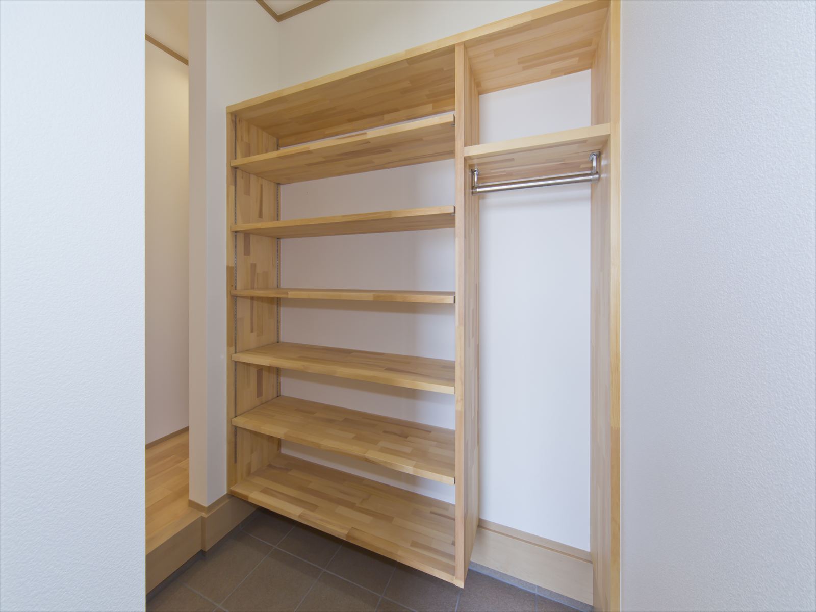 建物全体の床材にサクラの無垢フローリングを使用しているので、室内が明るく仕上がっています。リビングルームは、キッチンの木目調下がり天井とアクセントクロスが、シンプルでありながら個性的な印象を感じさせる一方、木目調の壁紙を天井に採用した和室は個室として、やすらげる雰囲気を感じさせてくれています。また、収納アイテムとして、人気のシューズクロークには、アウトセット片引き戸を取り付けたことによりプライベートな部分を遮蔽することができました。