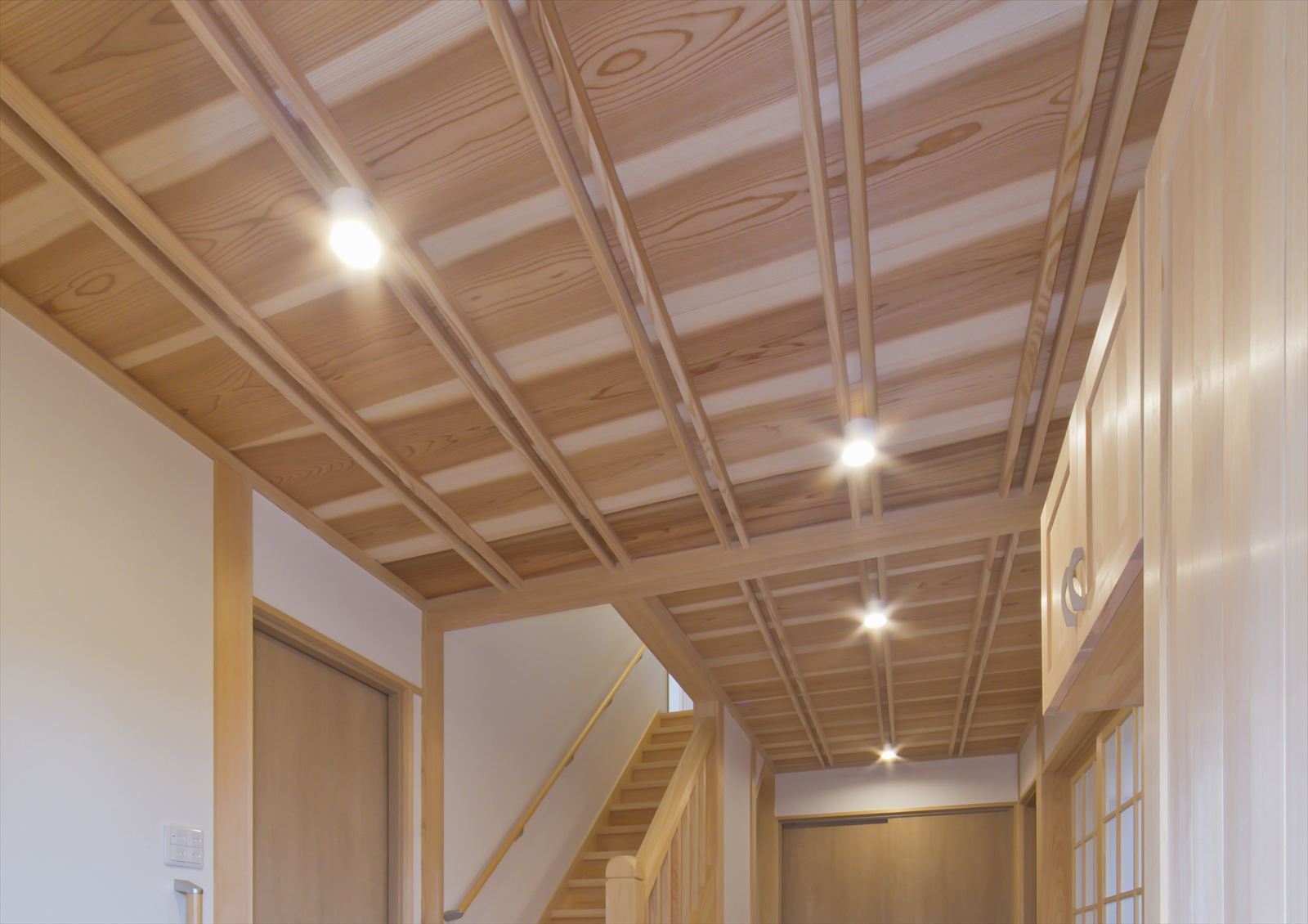 近年、建築の機会が少なくなった和風住宅ですが、完成した姿を見ると圧倒されます。まず、玄関に入ると桧で造作した階段が目に飛び込み、そのまま見上げると杉材で施工した格子の天井のダイナミックさに驚かされます。そこから見える下駄箱や建具は、無垢材を使用した造作品です。中に入ると、こちらも、格子の天井と手作り建具が印象的な、二間続きの和室が、訪れる人々を温かく迎え入れてくれます。和室には、広縁も設けられており四季を通して住む人の憩いの場となることでしょう。